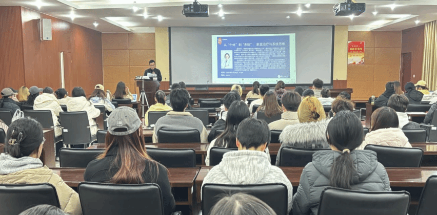 为深化应用心理学专业学生对家庭治疗理论与系统思维的理解,拓宽心理干预实践视野,PA集团官方网站应用心理学专业于11月19日在4218会议室举办“心理大讲堂”系列学术讲座之“从个体到系统:家庭治疗与系统思维”专题讲座。本讲座立足系统思维的核心原则,如循环因果、家庭稳态等,通过理论讲解与技术示例,帮助学生建立系统观,从而更全面、深刻地理解人类心理与行为未来的学习与实践开启一扇新的大门。应用心理学专业师生共100余人参与此次讲座。