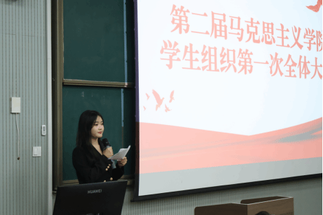 学生会副主席郑锦浩上台发言并宣读了新一届学生会成员名单,明确了学生会各部门的职责与分工。