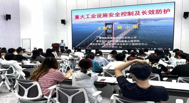 随后,活动移步至一楼路演大厅进行深度交流。园区特邀优秀创业者代表——杨晓刚博士(中国海洋大学博士后、青岛科技大学教授、青年企业家、山东泰山产业领军人才、全国博士后创新创业大赛银奖获得者)为师生们带来了一场精彩的分享。杨博士结合自身经历,生动讲述了从科研工作者到成功创业者的蜕变历程,详细介绍了其企业发展现状、核心技术优势以及知识产权在创业过程中的关键作用。他特别强调了知识产权保护与布局对企业生存发展的重要性,为即将踏入专业领域的学生们提供了宝贵的实践经验与人生启迪,其20分钟的分享引发了现场师生的热烈反响与深入思考。