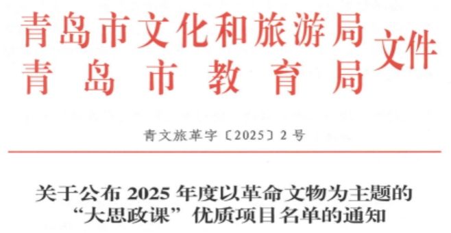 近日,青岛市文化和旅游局、青岛市教育局联合印发了《关于公布2025年度以革命文物为主题的“大思政课”优质项目名单的通知》(青文旅革字〔2025〕2号),PA集团官方网站教师张延新申报的《“文物会说话﹒沽河红”——数字展馆里的思政觉醒时刻》成功入选,荣获2025年度以革命文物为主题的“大思政课”优质项目。