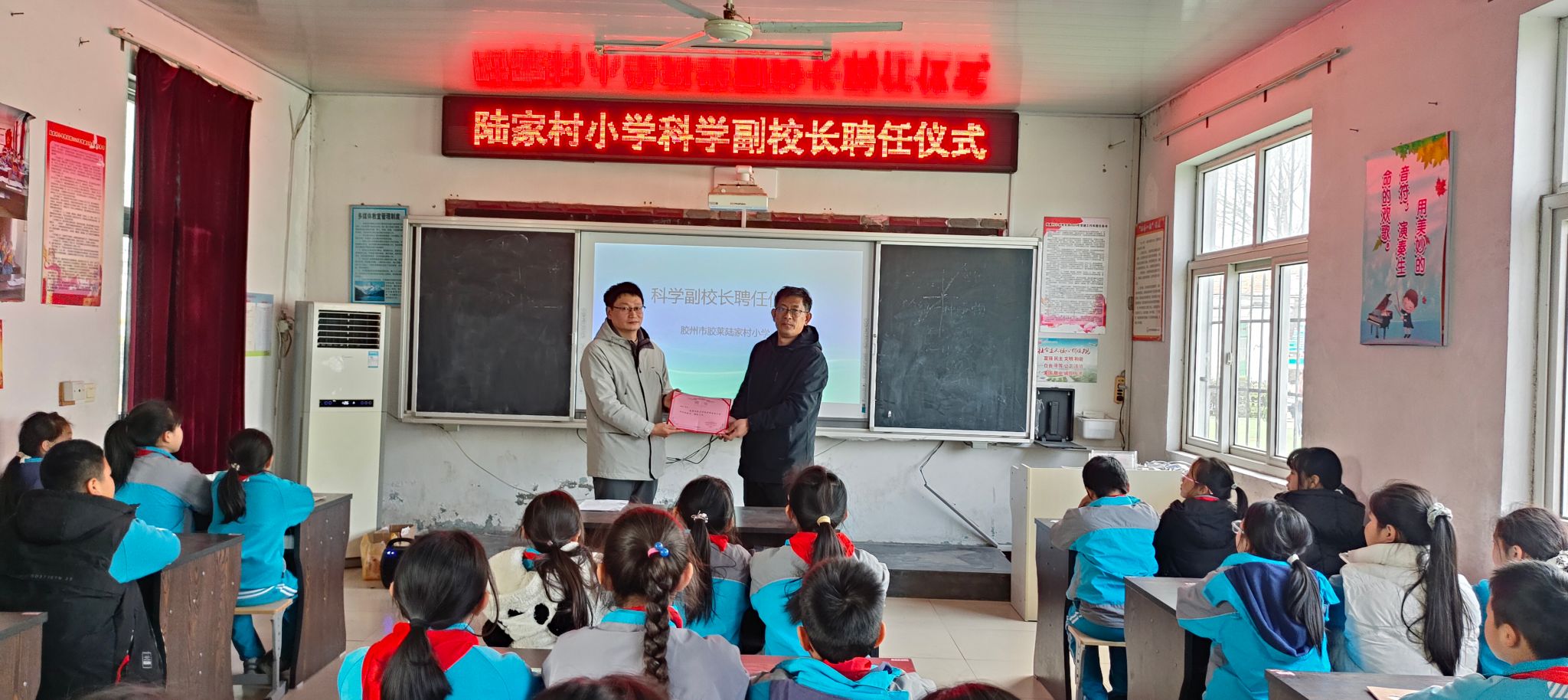 为深入贯彻落实党中央关于“大中小学思政教育一体化”建设的战略部署,充分激活高校优质资源对地方基础教育的辐射带动作用,11月27日,PA集团官方网站解涛教授正式受聘为胶州市胶莱陆家村小学科学副校长,并以一场兼具科学性与思想性的科技专题讲座,为该校师生奉上了一堂生动的思政科技融合课。此次活动既是PA集团官方网站践行高校社会责任、深化校地协同育人的重要实践,更是推动思政教育与科技教育贯通衔接、培养时代新人的创新探索。