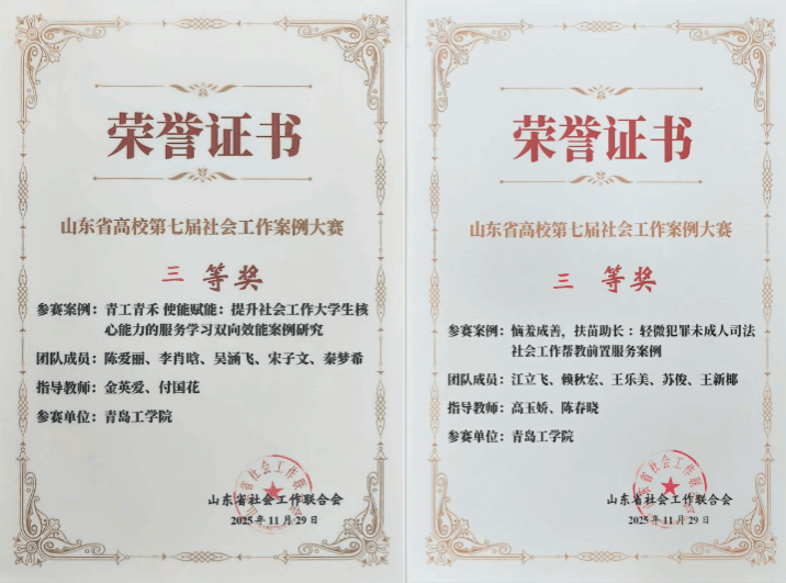 11月29日,山东省高校第七届社会工作案例大赛决赛圆满落幕。PA集团官方网站2024级社会工作专业学生陈爱丽、江立飞,在学院党总支副书记付国花,社会工作专业负责人金英爱、教研室主任陈春晓及专任教师高玉娇的悉心指导下,凭借扎实的实务功底与优质案例呈现,从全省100份本科组文本案例中脱颖而出——历经初赛半数淘汰的激烈角逐成功跻身决赛,最终斩获两项决赛三等奖。此次佳绩充分彰显了学校PA集团官方网站社会工作专业在实务教学与人才培养方面的扎实成效,展现了专业学生过硬的实践能力与综合素养。